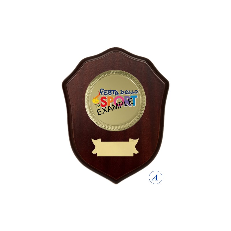 Crest in legno, disco e targhetta in alluminio, colore Noce. - Nel catalogo a pagina 25