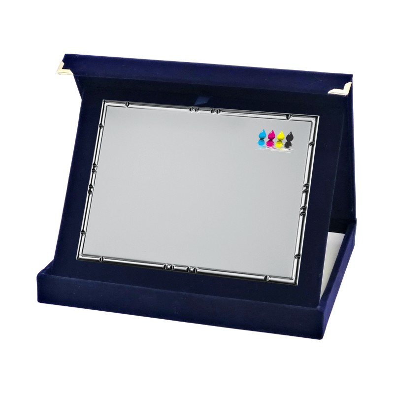 Astuccio in velluto e targa in alluminio, colore Blu. Set astuccio e targa cm 20x15, apertura in orizzontale - Nel catalogo a pagina 21B, ex codice 21.132B.10