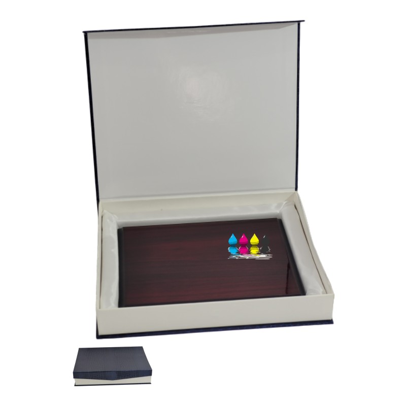 Legno, colore Noce. Prodotto fornito di astuccio lux con raso interno, utilizzabile come targa da stampare a colori o come supporto per ospitare targhe metalliche, provvisto di doppia asola sia in orizzontale che in verticale utili per appendere a muro la targa, prezzo per minimo pz 6 - Nel catalogo a pagina 25