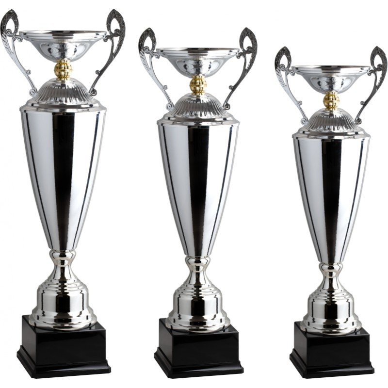 Tazza in metallo, gambo in plastica, base in plastica e resina, colore Argento. Trofeo a forma di anfora che coniuga elementi nuovi come un cono tornito molto affusolato, unico ed originale. Il prodotto, con l'esclusione della base e di un picollo dettaglio dorato, è tutto in metallo, restituendo pregio e sostanza per un trofeo particolarmente prestigioso e classico evergreen - Nel catalogo a pagina 2B