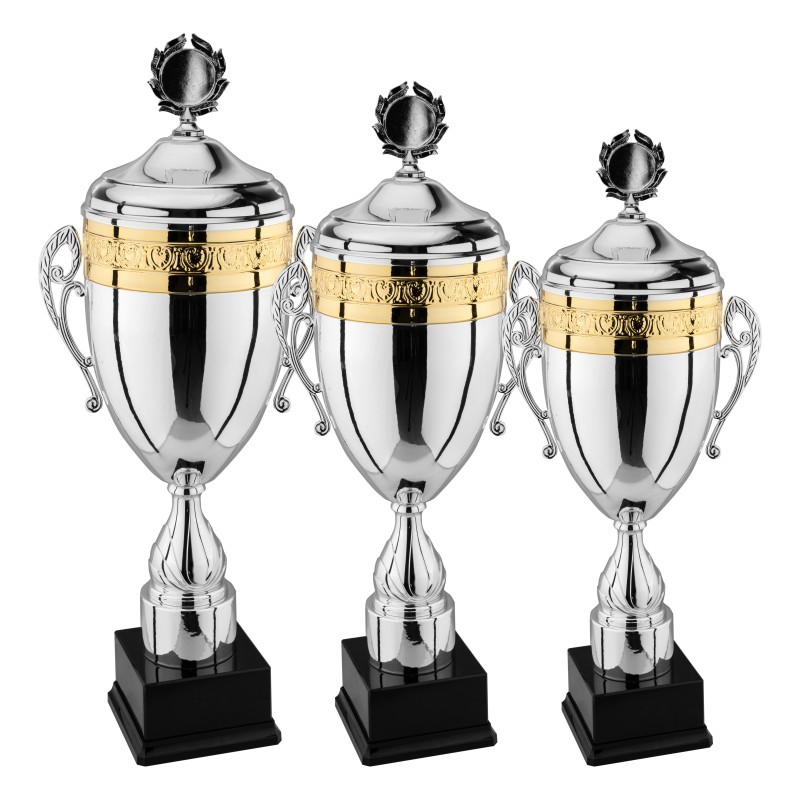 Tazza e coperchio in metallo, gambo in metallo e plastica, base in plastica e resina, colore Argento. Trofeo bicolore particolarmente elegante e dallo stile classico italiano, fornito con coperchio e fregio all'apice, con manici classici e parte del gambo in metallo per impreziosirne il valore complessivo, il prodotto è al top di gamma della nostra ultima collezione e della migliore ricerca di stile ed eleganza. - Nel catalogo a pagina 2