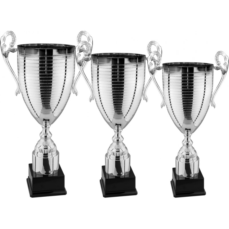 Tazza in metallo, gambo in metallo e plastica, base in plastica e resina, colore Argento. Trofeo classico della migliore tradizione italiana con tazza lavorata al tornio e manici importanti, gambo con nuovo elemento cilindrico in metallo prodotto di alto pregio, adatto ad essere utilizzato per premiazioni di prestigio, di importanza nazionale ed internazionale. - Nel catalogo a pagina 1