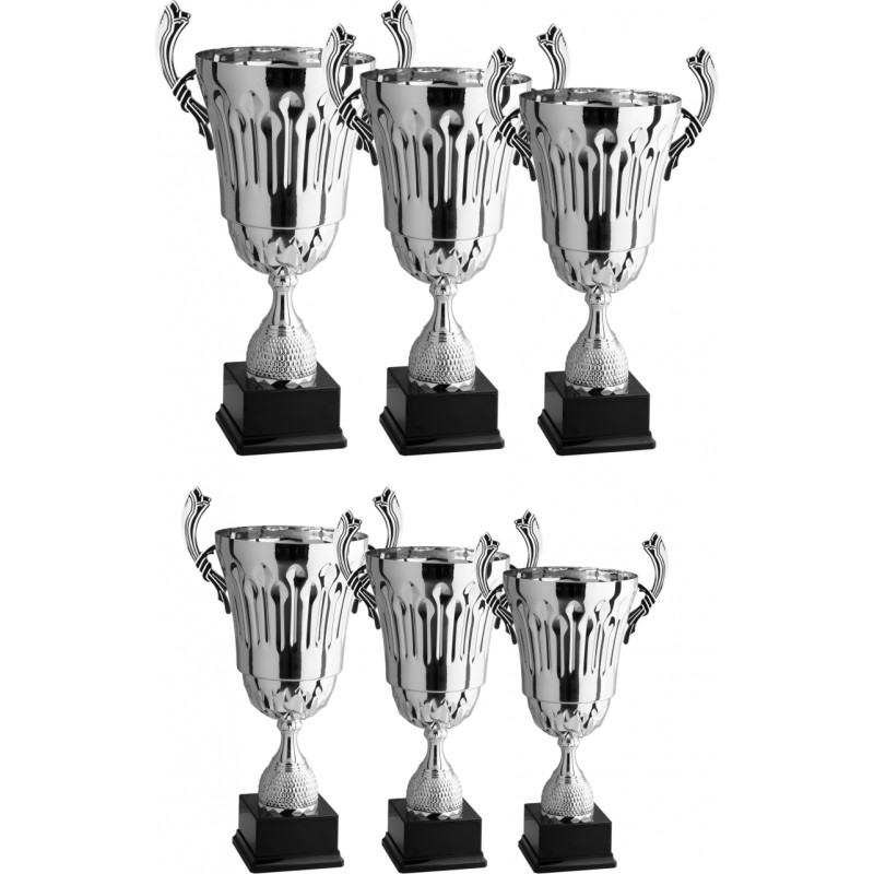 Tazza in metallo, gambo in plastica, base in plastica e resina, colore Argento. Trofeo moderno col. argento lucido, presenta molte lavorazione lungo tutta la circonferenza sia nella parte superiore che inferiore della tazza, cosi come nella parte bassa del gambo. Il prodotto è realizzata in ben sei diverse dimensioni da 62 a 35 cm, molto utile per premiazioni con podi lunghi, dove eventualmente è possibile raddoppiare alune dimensioni per arrivare a premiare ben oltre il sesto classificato. La creatività del progettista imprime uno stile molto attraente adatto ad ogni evento. - Nel catalogo a pagina 3