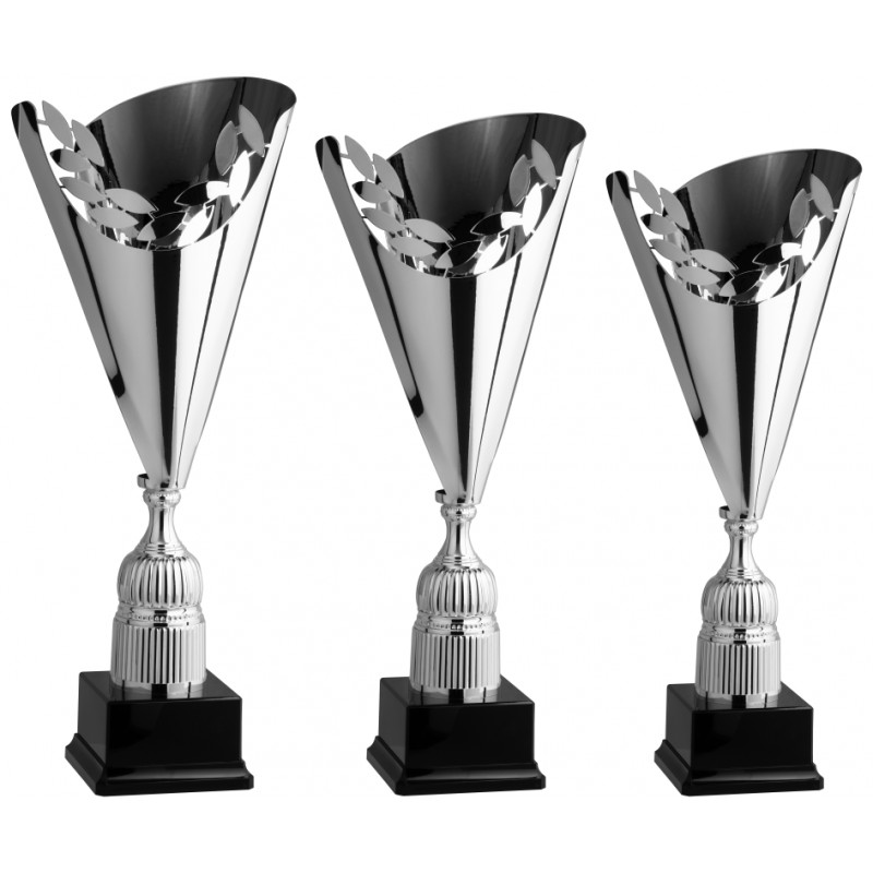 Tazza in metallo argentato, gambo in plastica argentata, base in plastica nero lucido e resina, colore Argento. Trofeo laser a forma conica tridimensionale con speciale lavorazione al laser, sulla parte alta presenta numerose foglie che richiamano all'alloro delle migliori vittorie e competizioni non solo sportive ma anche di tipo culturale, nonché l'utilizzo potrà essere per promuovere aziende e istituzioni. Il valore è amplificato dall'innovazione del design alla base del prodotto. - Nel catalogo a pagina 2B