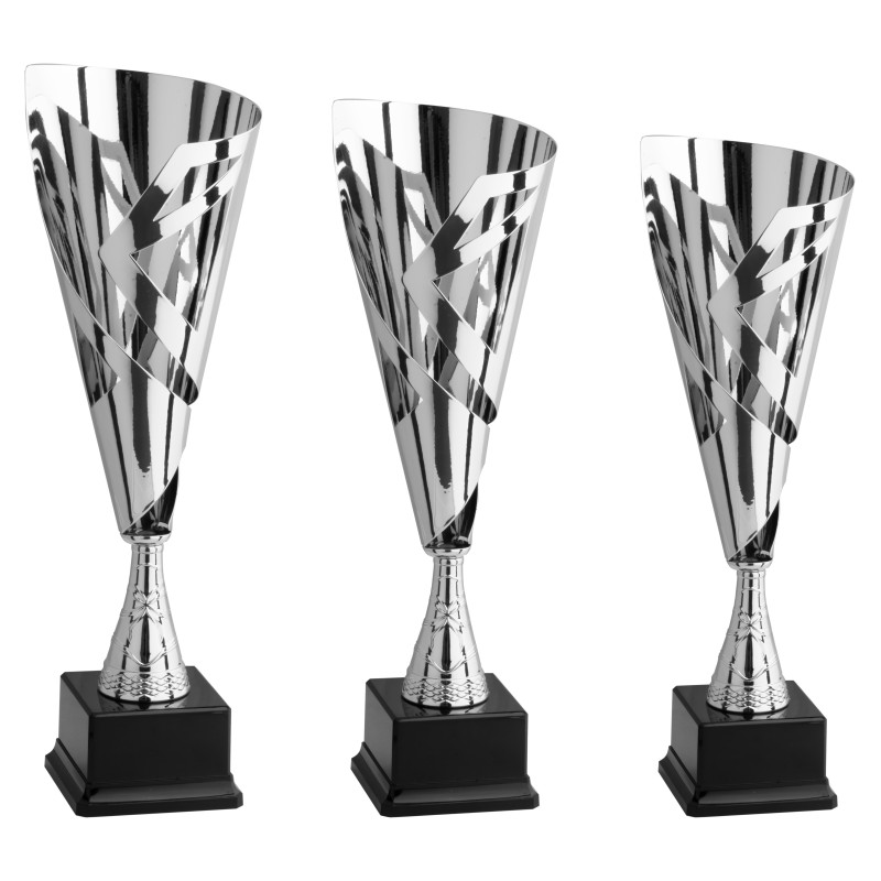 Tazza in metallo argentato lucido, gambo in plastica argentato, base in plastica nero lucido e resina, colore Argento. Trofeo laser molto conveniente e dal disegn italiano innovativo e moderno, un prodotto che incontra le esigenze di molte organizzazioni di eventi per stile ed economia. - Nel catalogo a pagina 4C