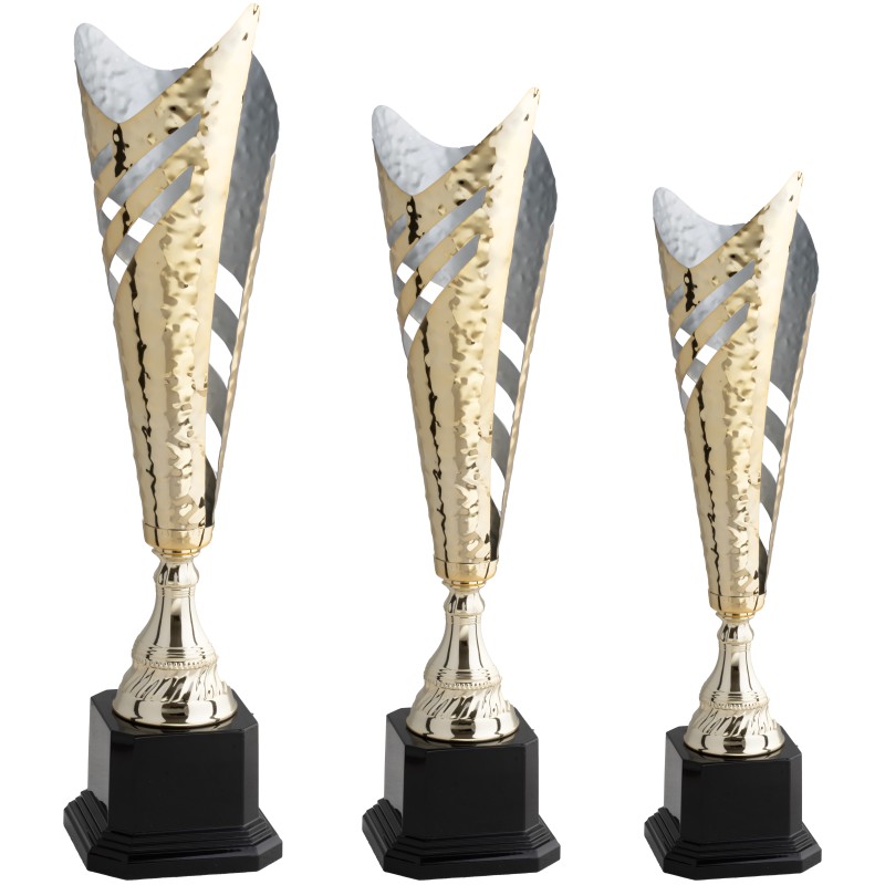 Tazza in metallo grinzato argentato lucido, gambo in plastica argentato, base in plastica nero lucido e resina, colore Oro. Trofeo moderno, di stile deciso e sobrio con lavorazione della tazza con metallo grinzato, La doppia colorazione è esaltata dal contrasto lucido esterno e opaco interno. Un incrocio di caratteristiche unico ed originali che ne fanno un trofeo di grande pregio. - Nel catalogo a pagina 4D