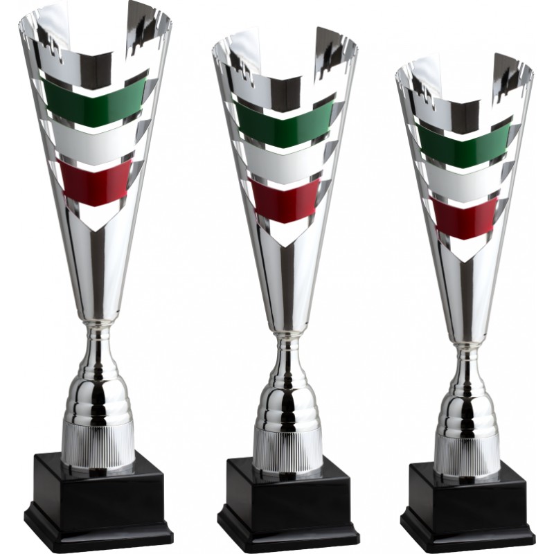 Tazza in metallo argentato, gambo in plastica argentata, base in plastica nero lucido e resina, colore Argento. Trofeo moderno realizzato partendo da un disegn cad che ha disposto il taglio laser della lamiera e poi le lavorazioni successive sono state artigianali, la forma conica, la verniciatura lucida sotto vuoto e il successivo passaggio di tre colori della bandiera d'Italia. Un lavoro articolato per un prodotto di grande emozione per tutti coloro che lo porteranno a casa riportando i colori del nostro stato italiano. Auguri a tutti i vincitori di questo bel prgetto - Nel catalogo a pagina 4A