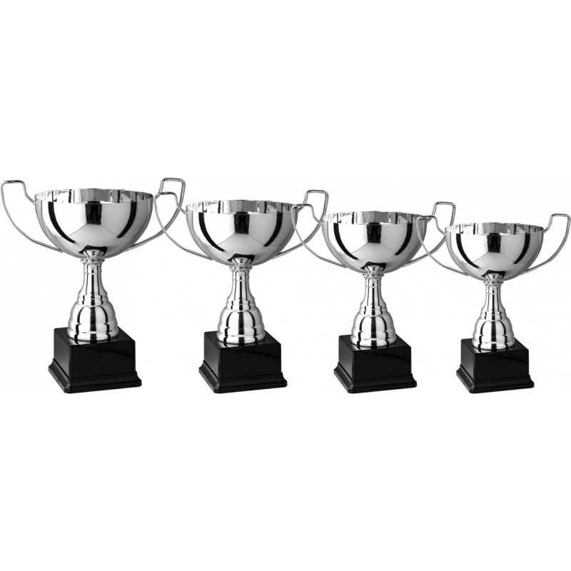 Tazza in metallo, gambo in plastica, base in plastica e resina, colore Argento. Trofeo evegreen dai manici ultra lusso e di particolare raffinatezza, il prodotto è classico di fattura moderna, le sue forme semplici e lucide ne esaltano lo stile e ne conservano tutto il fascino dell'emozione che trasportano durante la premiazioni. - Nel catalogo a pagina 7A