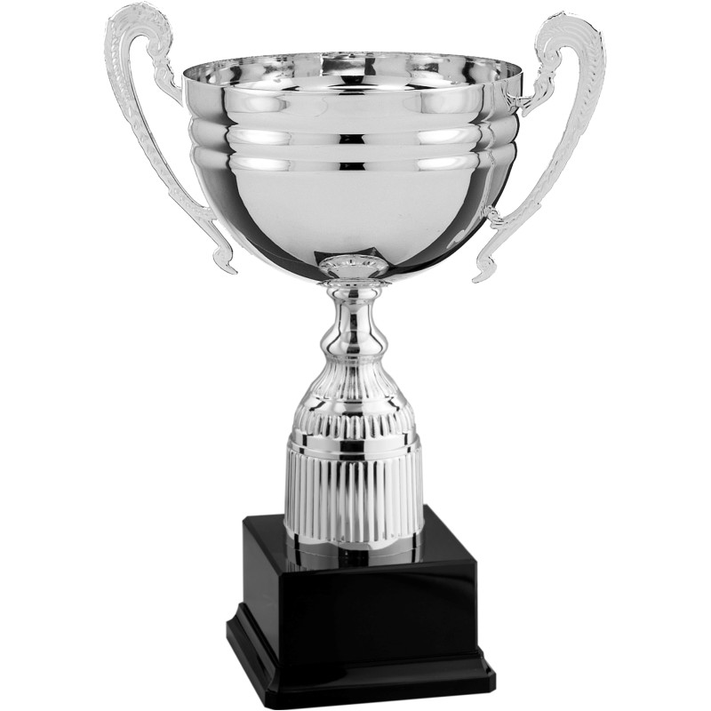 Tazza in metallo, gambo in plastica, base in plastica e resina, colore Argento. Trofeo evergreen di forma liscia con 2 righe semplici e manici in metallo, può ospitare il coperchio - Nel catalogo a pagina 6