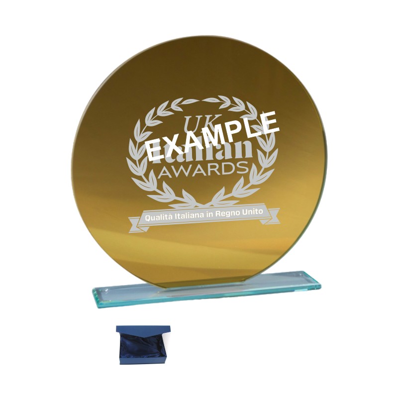 Vetro, colore Oro. Prodotto fornito con box blu con raso interno. Personalizzabile con incisione o transfer. Prezzo per quantità minimo 6 pz. - Nel catalogo a pagina 25C